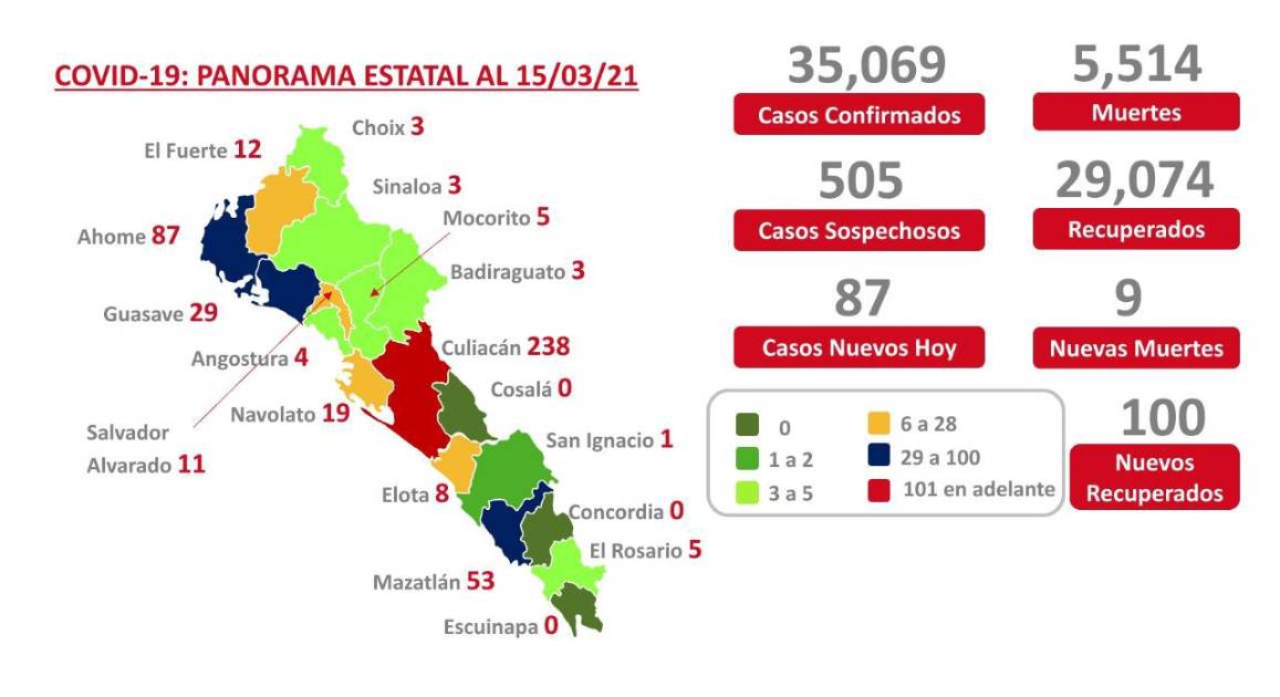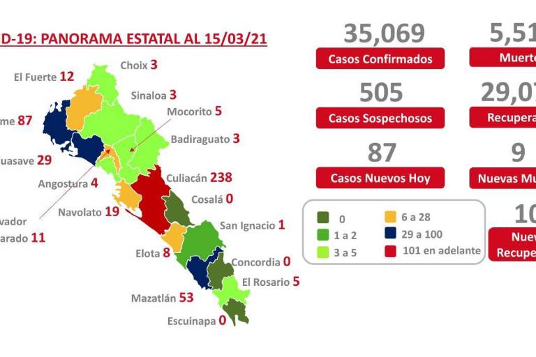 La Secretaría de Salud estatal confirmó 87 nuevos contagios de Covid-19 y con ellos Sinaloa alcanzó los 35 mil 069 infectados desde el 28 de febrero del 2020.