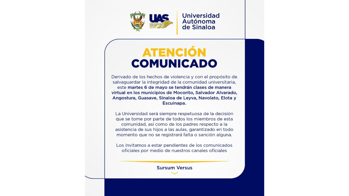 La Universidad Autónoma de Sinaloa anunció la suspensión de clases presenciales en ocho municipios a causa de la jornada de violencia registrada este lunes.