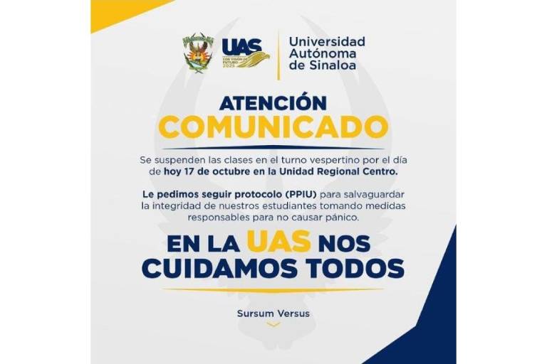 La Universidad Autónoma de Sinaloa suspendió sus clases del turno vespertino en la región centro del estado.