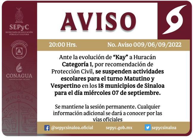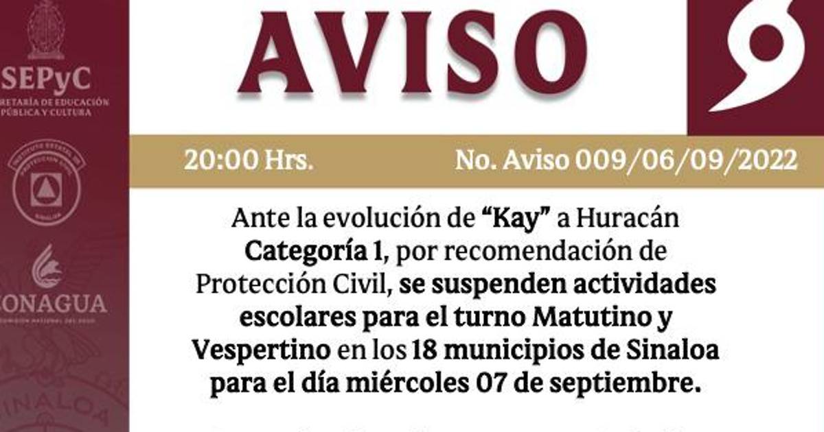 Este miércoles, las actividades escolares serán suspendidas debido al pronóstico del clima en relación con el huracán Kay, informó la Secretaría de Educación Pública y Cultura del Estado de Sinaloa.