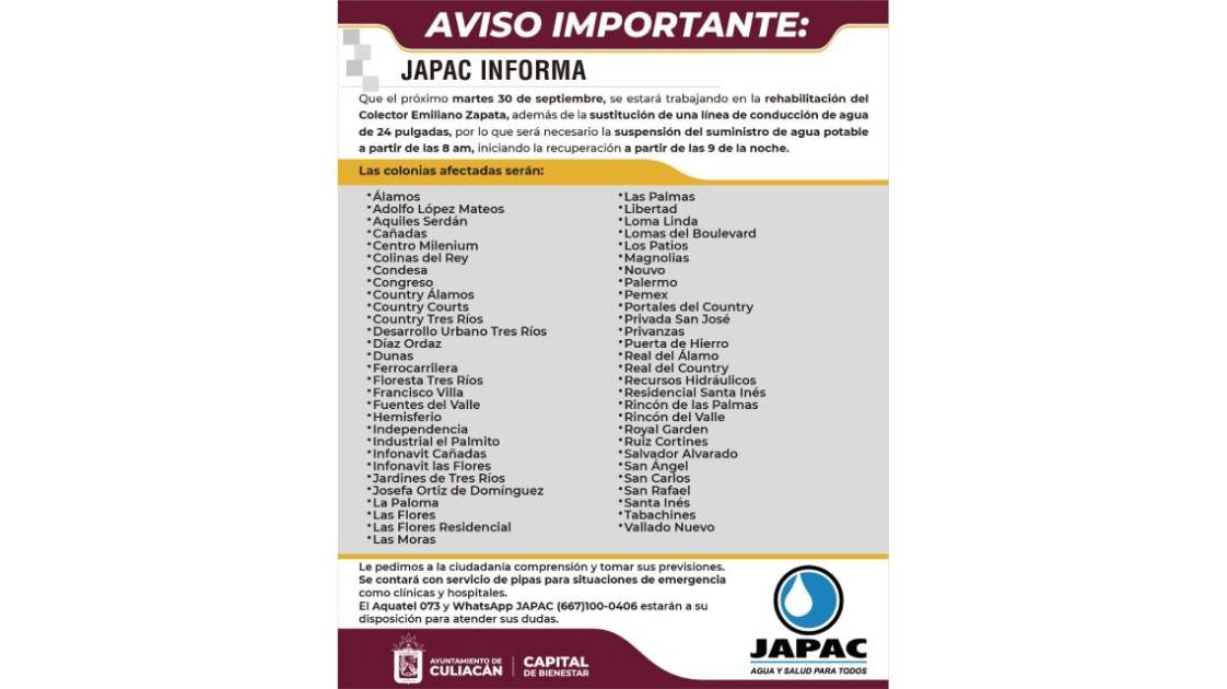 La Junta de Agua Potable y Alcantarillado de Culiacán anunció que el próximo martes 30 de septiembre suspenderá el suministro de agua potable en 57 colonias debido a trabajos de rehabilitación del Colector Emiliano Zapata y la sustitución de una línea de conducción de 24 pulgadas.