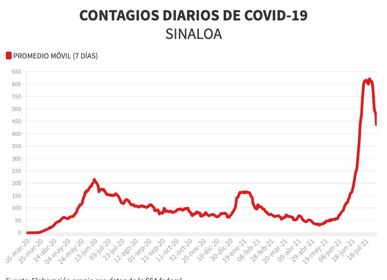 De acuerdo con el análisis de Noroeste, que calcula el promedio móvil de siete días, los contagios diarios promediaron 432 diarios al día 3 de agosto pasado, después de haber alcanzado un máximo histórico de 621 casos el 24 de julio anterior.