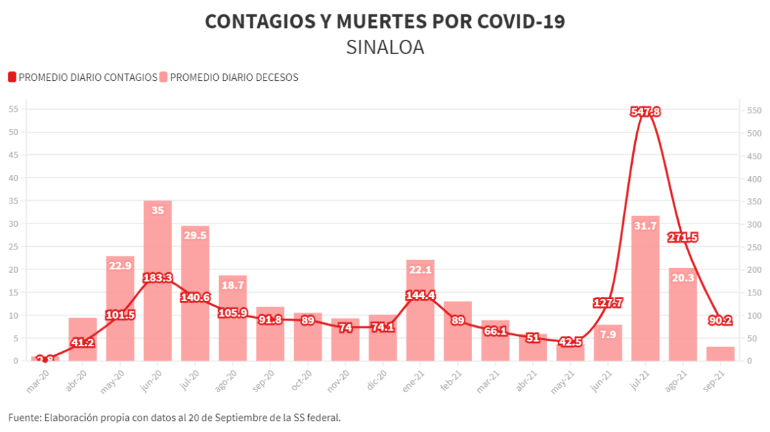 De acuerdo con los datos de la Dirección Nacional de Epidemiología de la Secretaría de Salud federal al día 20 de septiembre, el promedio diario de contagios para este mes en el estado es de 90 casos, después de haber alcanzado un máximo de 547 en julio y 275 en agosto pasados