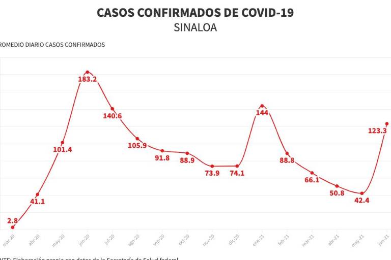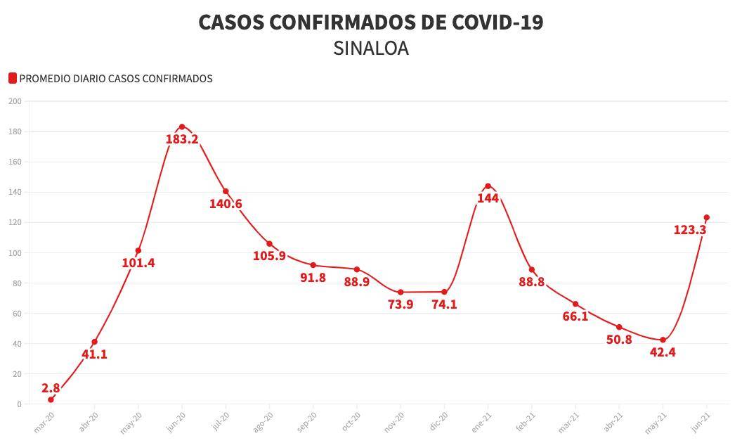 La tercera ola de Covid-19 en Sinaloa es un hecho. El promedio de contagios para el mes de junio fue de 123.3 casos diarios, apenas 20 casos por debajo de los 144 casos diarios registrados como máximo de la segunda ola pero todavía lejos de los 184 casos diarios registrados en la primera ola del mes de junio de 2020. Esto de acuerdo con los datos de la Dirección Nacional de Epidemiología de la Secretaría de Salud federal.