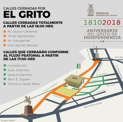 Mañana sábado 15 de septiembre, a partir de las 17:00 horas las calles del Palacio de Gobierno estarán cerradas a la circulación con motivo del Grito de Independencia; los cierres podrían extenderse de acuerdo al incremento del flujo peatonal, informó Gobierno del Estado.