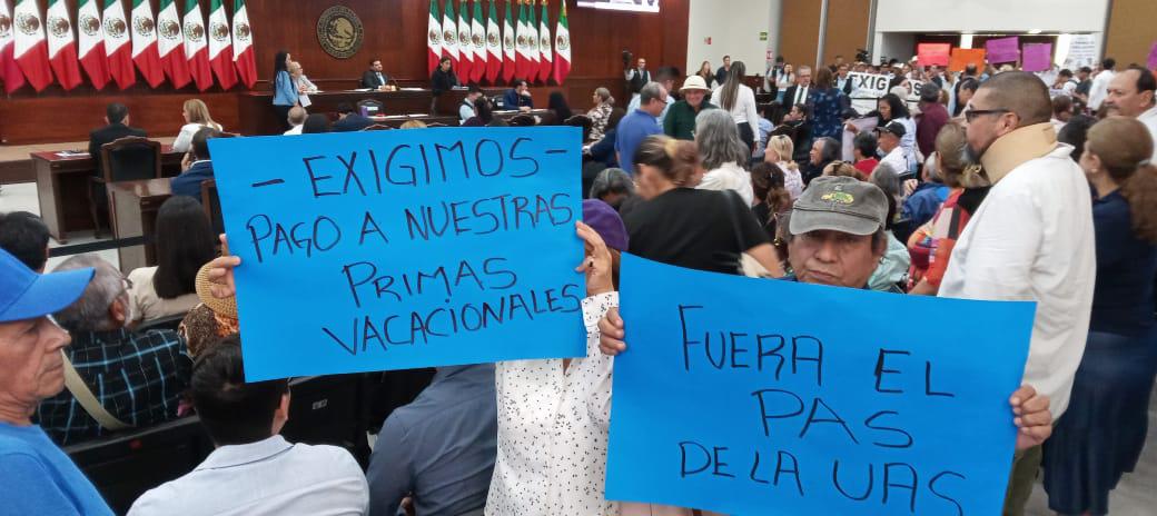 CULIACÁN._ Un grupo de trabajadores jubilados de la Universidad Autónoma de Sinaloa se congregó este jueves en el Congreso del Estado para manifestarse en contra la reingeniería financiera impulsada por la institución, y exigir el pago de las primas vacacionales y la salida del Rector Jesús Madueña Molina.