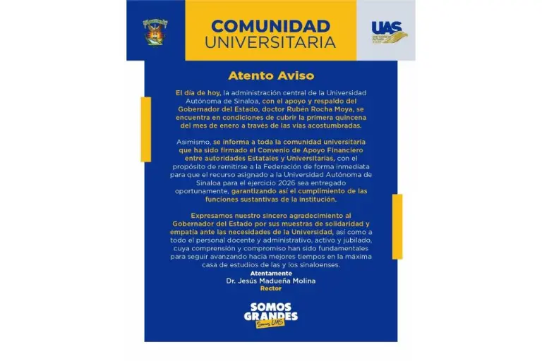 La Universidad Autónoma de Sinaloa informó que se encuentra en condiciones de cubrir el pago correspondiente a la primera quincena del mes de enero, luego del respaldo otorgado por el Gobierno del Estado, encabezado por el Gobernador Rubén Rocha Moya.