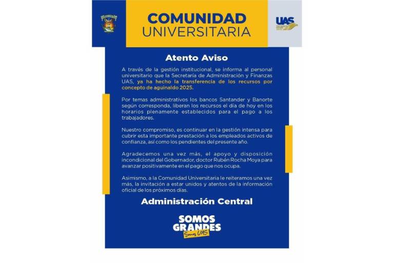 A través de un comunicado emitido por la Administración Central, la institución detalló que la Secretaría de Administración y Finanzas de la UAS efectuó la transferencia de los recursos, por lo que el pago comenzará a reflejarse conforme a los tiempos establecidos por las instituciones bancarias.
