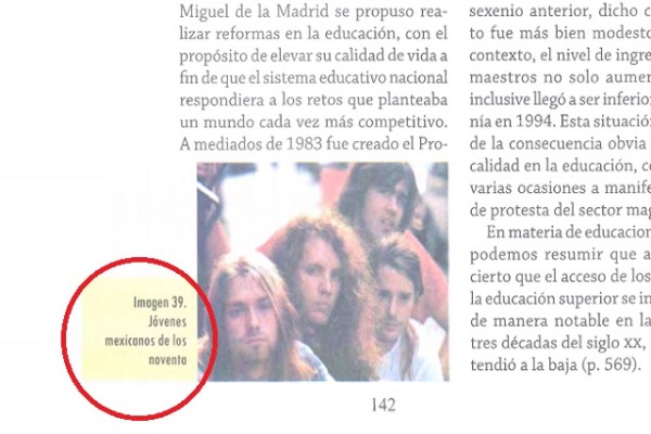 El libro -cuya primera edición fue publicada en agosto del 2016 y en el cual se especifica que las ilustraciones fueron tomadas de Internet- muestra en su página 142 una fotografía del grupo de rock estadounidense liderado por el fallecido Kurt Cobain, para ejemplificar a "jóvenes mexicanos de los noventa" como parte de la Unidad III: 'Del surgimiento del populismo a la transición del 2000 en México'.