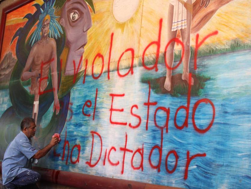 Con ayuda de thinner, personal adscrito a la dirección de Servicios Generales borró los mensajes de protestas en los que señalaron “El violador es el Estado, Rocha dictador”.