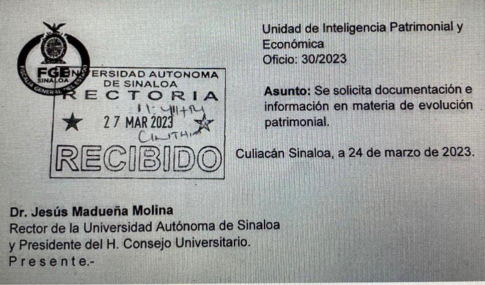 Desde el pasado 27 de marzo, la Unidad de Inteligencia Financiera y Patrimonial del Estado de Sinaloa solicitó al Rector de la Universidad Autónoma de Sinaloa información patrimonial sobre tres personas de apellido Cuen Díaz.