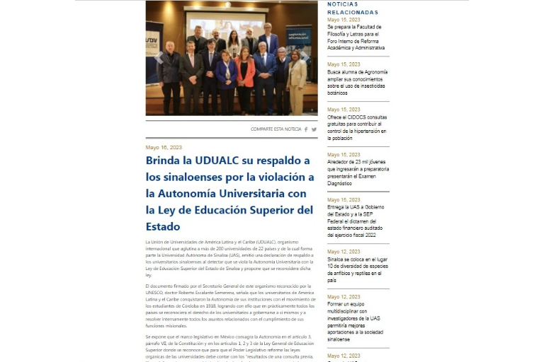 La Universidad Autónoma de Sinaloa compartió esta noticia a través de un boletín en su sitio web, mismo que puede consultarse en https://dcs.uas.edu.mx/noticias/6710/brinda-la-udualc-su-respaldo-a-los-sinaloenses-por-la-violacion-a-la-autonomia-universitaria-con-la-ley-de-educacion-superior-del-estado.