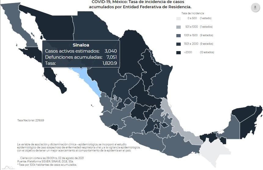 Este lunes fueron confirmados 488 nuevos infectados, menos que este domingo que fueron 501. Los nuevos casos corresponden 191 a Culiacán, 95 a Ahome, 92 a Mazatlán, 39 a Guasave, 33 a Navolato, 14 a Escuinapa, 13 a Rosario, tres a Sinaloa, mientras que El Fuerte, Mocorito, Angostura y Cosalá suman dos cada uno. Entre el 28 de febrero del 2020 y el 2 de agosto del 2021 fueron detectados en Sinaloa 58 mil 669 contagios de coronavirus.