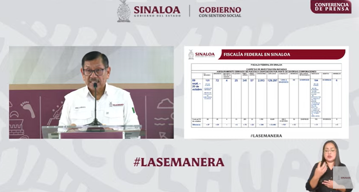 El Secretario de Seguridad Pública en Sinaloa, Gerardo Mérida Sánchez, dio a conocer los resultados de los operativos implementados por los tres órdenes de gobierno, del 9 de septiembre al 20 de octubre, en los que destaca las 120 carpetas de investigación y la detención de 72 personas.