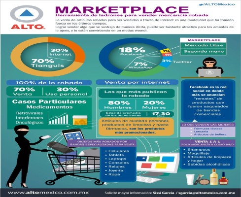 ALTO México identificó a través de su estudio que las personas que se dedican a vender productos robados, ocupan redes sociales para promocionarse: el 18 por ciento a través de Facebook, el 7 por ciento por medio de grupos de Whatsapp, el 3 por ciento en Twitter; y el 1 por ciento de cada uno se promociona por medio de Mercado Libre y Segunda Mano.