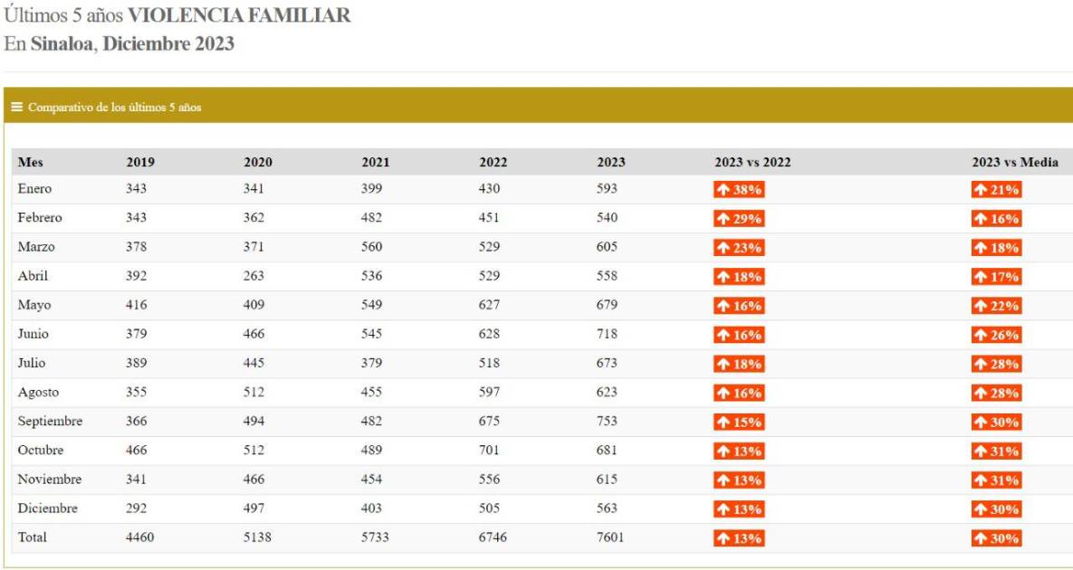 En ese sentido, continuó una tendencia ascendente en cifras de violencia familiar desde 2019 cuando registraron 4 mil 460 casos, para 2020 subió a 5 mil 138, en 2021 pasaron a 5 mil 733, en 2022 hubo 6 mil 746 hasta llegar a 7 mil 601 de 2023.