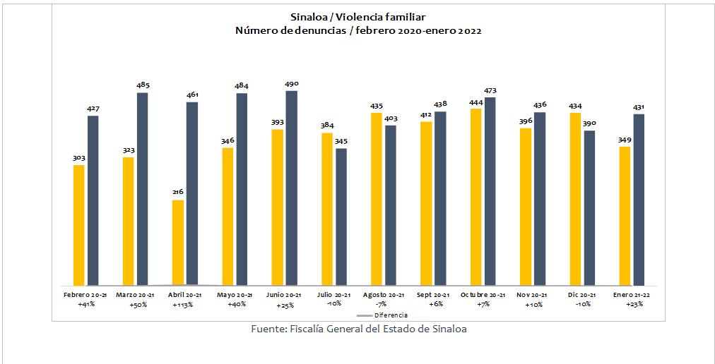 “El delito de violencia familiar en enero de 2022 registró un aumento de 23% contra enero de 2021 y del 11% contra diciembre de 2021. La tasa anual acumulada de febrero de 2021 a enero de 2022 fue de casi 174 delitos por cada 100 mil habitantes, superior a la tasa del periodo anual anterior que fue de 147”, dice el diagnóstico.