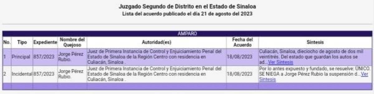 “Por lo antes expuesto y fundado, se resuelve: ÚNICO. SE NIEGA a Jorge Pérez Rubio la suspensión definitiva. Notifíquese”, se lee en la resolución del expediente 857/2023 de este 21 de agosto.