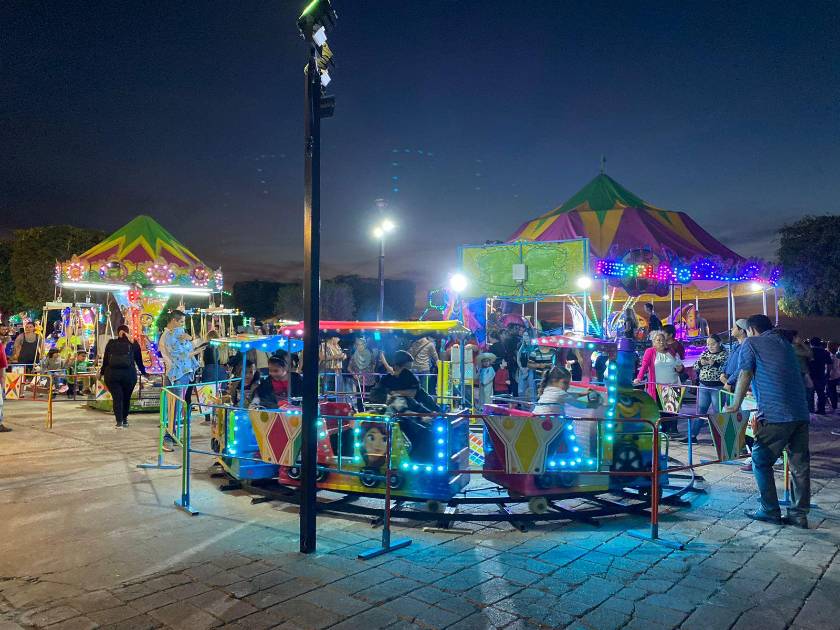 Cientos de niñas y niños disfrutan de los atractivos, de los cumplíos, el trenecito, el gusanito y otros juegos mecánicos que con luces y colores llamativos adornan el paisaje y el ambiente de fiesta y diversión.