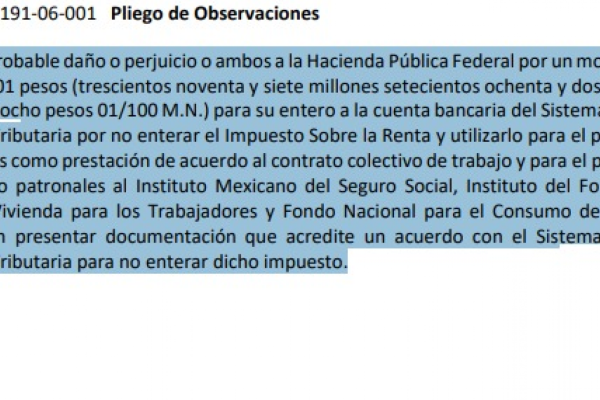 "Se presume un probable daño o perjuicio o ambos a la Hacienda Pública Federal por un monto de 397,782,228.01 pesos (trescientos noventa y siete millones setecientos ochenta y dos mil doscientos veintiocho pesos 01/100 M.N.) para su entero a la cuenta bancaria del Sistema de Administración Tributaria por no enterar el Impuesto Sobre la Renta y utilizarlo para el pago a los trabajadores como prestación de acuerdo al contrato colectivo de trabajo y para el pago de cuotas obrero patronales al Instituto Mexicano del Seguro Social, Instituto del Fondo Nacional de la Vivienda para los Trabajadores y Fondo Nacional para el Consumo de los Trabajadores, sin presentar documentación que acredite un acuerdo con el Sistema de Administración Tributaria para no enterar dicho impuesto", se lee en el informe.