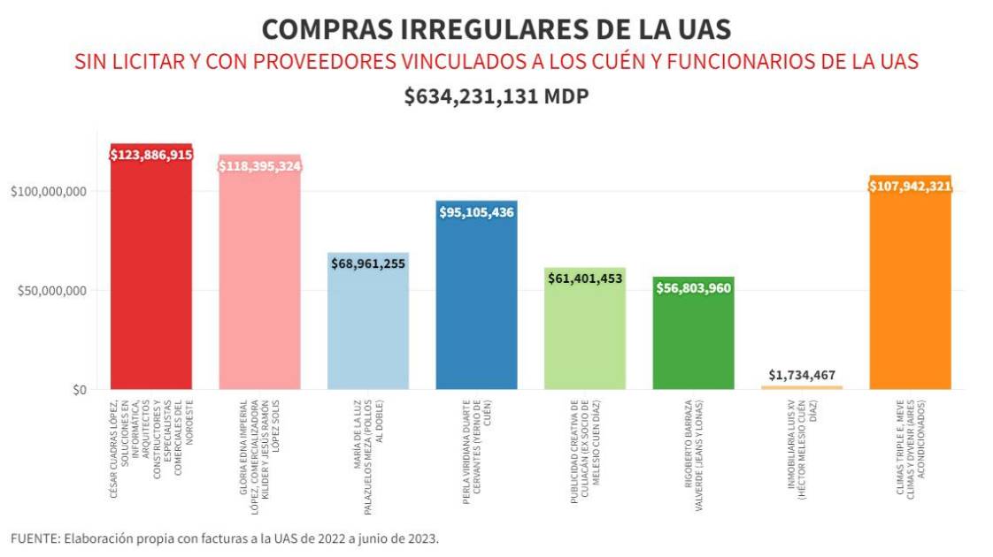 Hasta ahora, las operaciones sin licitar y con sobreprecios en las compras de la UAS a diversas redes de empresas y personas físicas relacionadas con la familia Cuén, funcionarios y empleados de la misma Universidad alcanzan la cifra de 634 millones 231 mil 131 pesos de 2017 a junio de 2023.