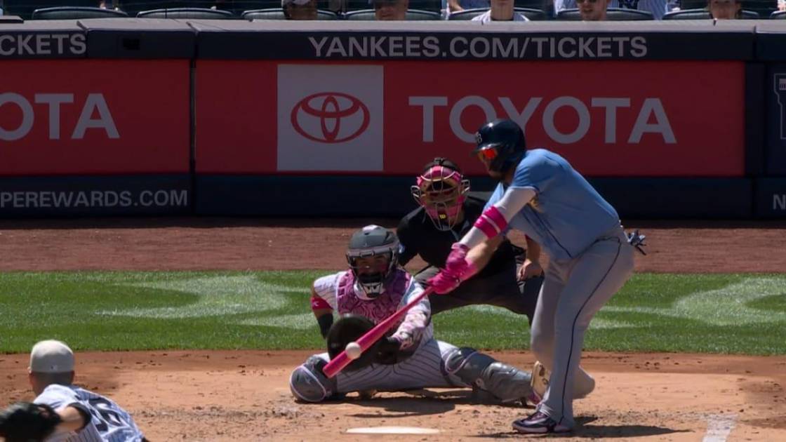 Randy Arozarena empató la pizarra con un elevado de sacrificio con casa llena en una entrada de cinco carreras frente a Clarke Schmidt (1-4), batazo que atrapó el jardinero central Harrison Bader de manera espectacular para evitar dos carreras.