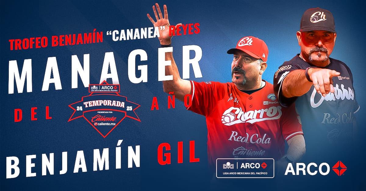 Por segundo año consecutivo y también por segunda ocasión en su carrera, el timonel de los Charros de Jalisco, Benjamín Gil, gana el Trofeo llamado Benjamín ‘Cananea’ Reyes al Mánager del Año, por lo hecho en el rol regular de la Temporada 2024-2025 de la Liga Mexicana del Pacífico.