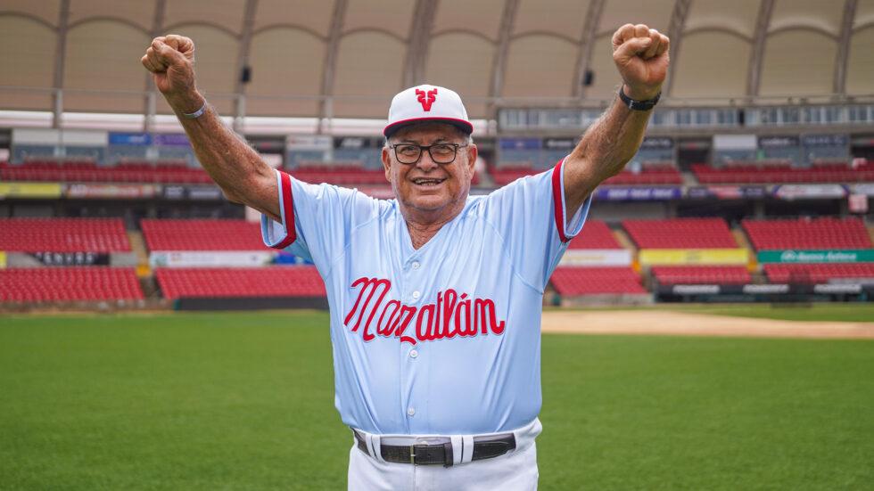 El encargado de revelar el uniforme fue Carlos “El Chaflan” López, ex jugador de Grandes Ligas y figura histórica de la novena roja, quien con su presencia rindió tributo a las ocho décadas de legado del club.