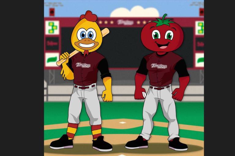 El informe se acompaña de una imagen de Tommy Tomate y el Pollo Tomás en el que detalla que su vestimenta tiene como base el uniforme clásico del beisbol, con medias altas y el jersey guinda.