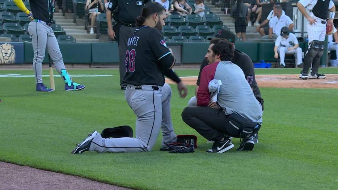 Suárez, luego de hacer contacto de foul con el primer lanzamiento, mostró dolor inmediato tras recibir el pelotazo y se dirigió directamente al dugout visitante, cayendo de rodillas mientras era atendido por el dirigente Torey Lovullo y el preparador físico Max Esposito. Aunque corrió las bases para completar la parte alta del episodio, fue sustituido por el también venezolano Ildemaro Vargas en la parte baja del acto.