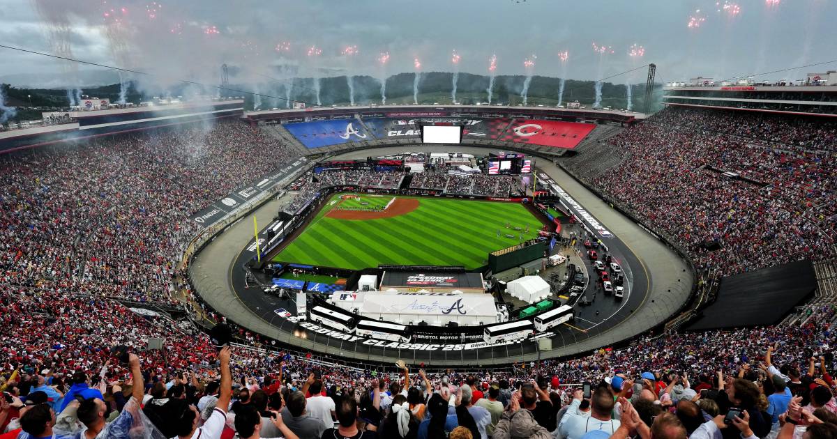 Luego de una gran ceremonia inaugural para celebrar el primer Speedway Classic de MLB, el cielo se abrió sobre el famoso Bristol Motor Speedway y la lluvia retrasó el inicio del histórico enfrentamiento entre los Bravos y los Rojos por dos horas y 17 minutos. El juego finalmente comenzó, pero fue suspendido con un out en la parte baja del primer inning.