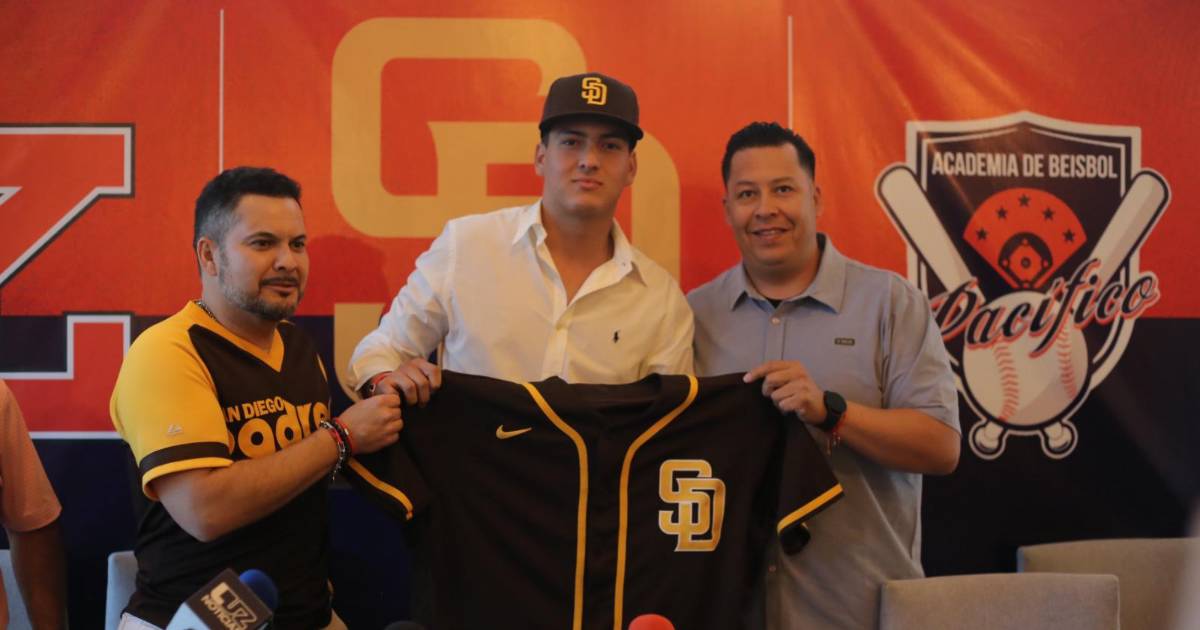 Para sellar la firma simbólica se le entregó al joven zurdo una gorra y casaca de los Padres de San Diego.