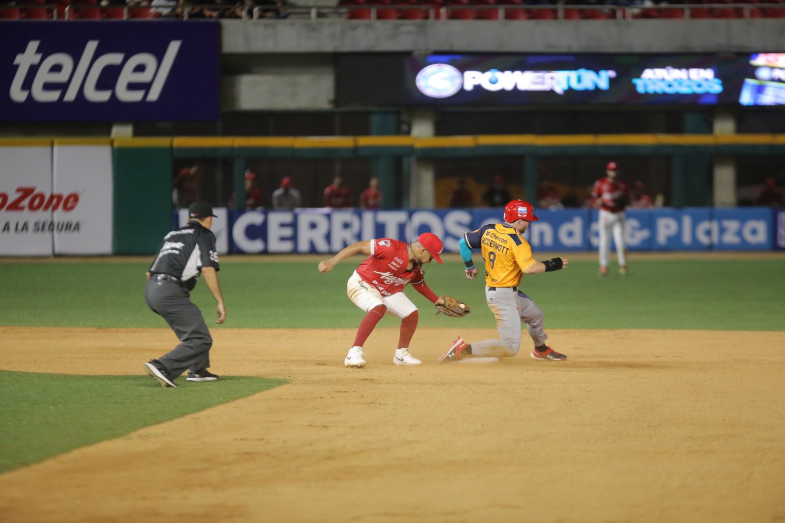 Matt McDermott inició el juego con hit al derecho, Julián Escobedo lo imitó, enseguida Brantley Bell los adelantó con sacrificio, Téllez apretó el brazo al ponchar al cuarto en el orden Luis Juárez, pero vendría la primera en error de Alex Liddi a batazo de Mike Hart.