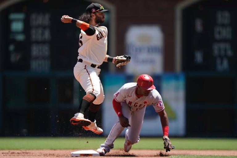 SAN FRANCISCO._ Evan Longoria conectó un cuadrangular de dos carreras en la cuarta entrada antes de abandonar el juego con un dolor en el músculo del lado derecho, LaMonte Wade Jr. se voló la barda en la siguiente entrada para apoyar a Johnny Cueto, y los Gigantes de San Francisco vencieron el lunes 6-1 a los Angelinos de Los Ángeles.