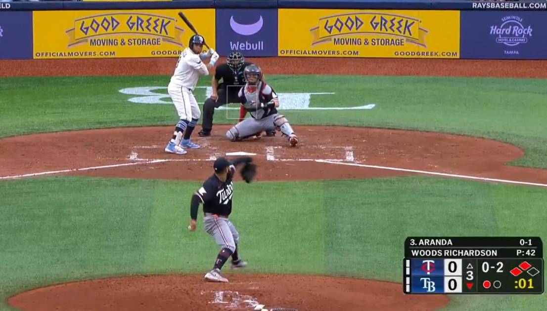 Toda la producción ofensiva de los Rays en el final de la serie llegó en la tercera entrada, cortesía de dos batazos grandes de dos de sus bateadores más importantes. Con corredores en segunda y tercera base con un out, el mexicano Jonathan Aranda castigó una recta de Simeon Woods Richardson con dos strikes que resultó en un sencillo remolcador de dos rayas por el canal del jardín derecho y central.