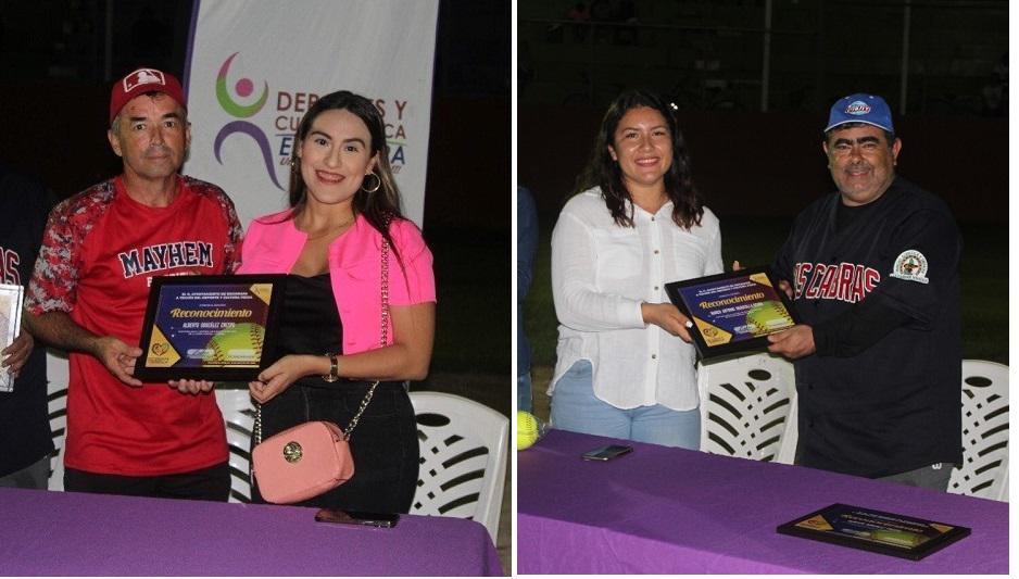 Las autoridades municipales hicieron entrega de reconocimiento a dos destacados impulsores del softbol en el municipio como lo son Marco Muratalla y Alberto González Crespo.