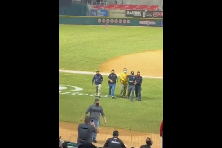 Cuando iba a iniciar la parte baja de la novena entrada del juego, el ampáyer Humberto “Lobito” Saiz fue sacado por elementos de seguridad del recinto y también por agentes de la policía, quienes le llevaban con las manos sujetas por la espalda y tomado de la nuca.
