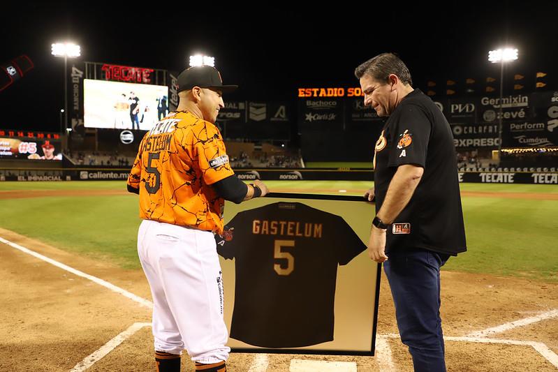 Al concluir la quinta entrada vino la ceremonia del retiro del número 5 de Carlos Gastélum en un emotivo acto donde el infielder Naranja agradeció a la afición por su apoyo durante las 18 temporadas que ha vestido el jersey de Hermosillo.
