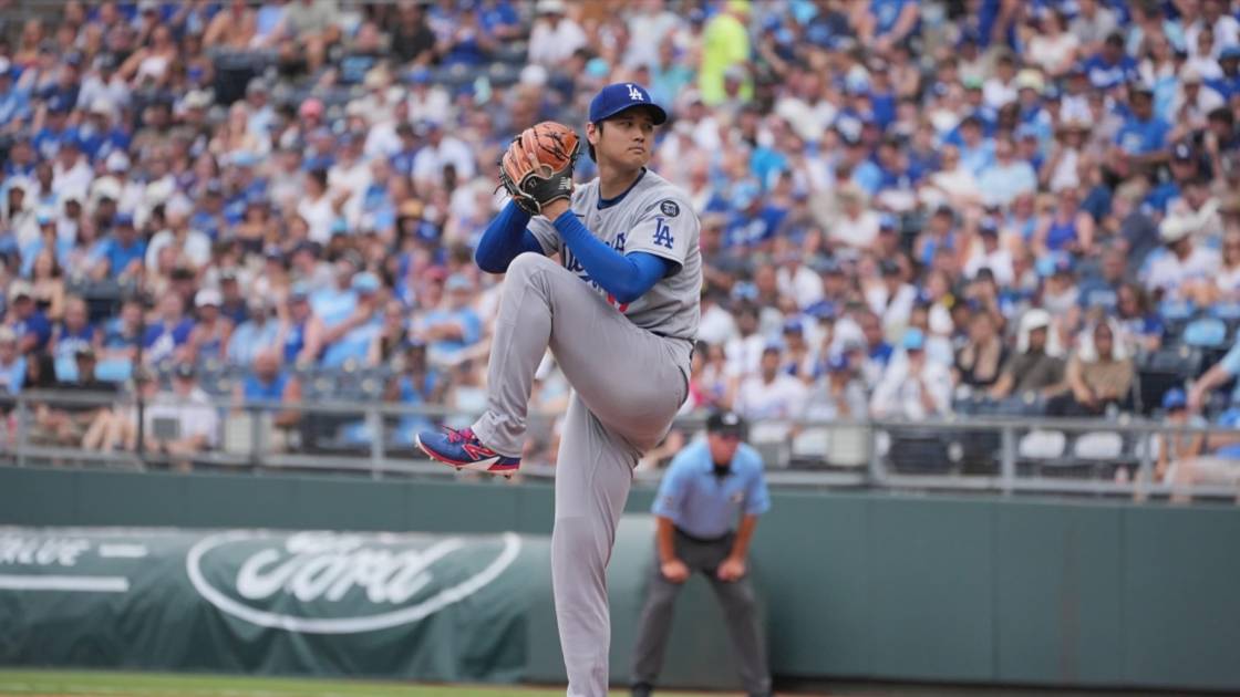 En su tercera apertura con los Dodgers el sábado contra los Reales en el Kauffman Stadium, Ohtani provocó una doble matanza con un rodado que salió del bate de Vinnie Pasquantino tras una recta de cuatro costuras de 101.7 millas por hora; el lanzamiento más rápido de su carrera en Grandes Ligas.