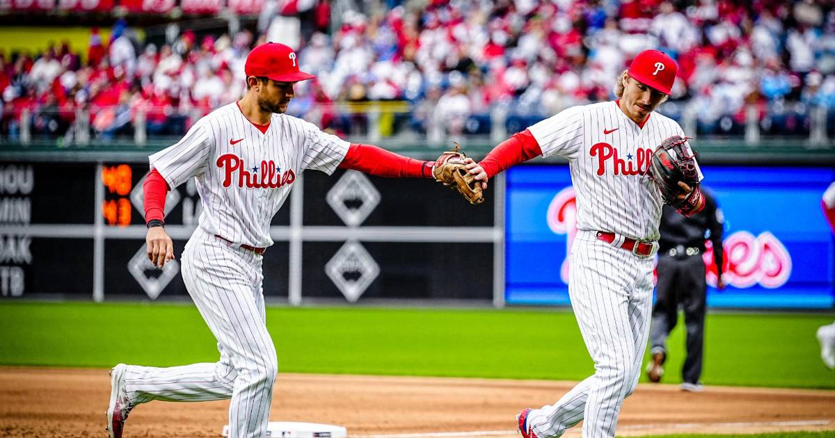 Bryce Harper y Rhys Hoskins, los dos astros lesionados de Filadelfia, izaron el gallardete de campeones de la Liga Nacional de 2022, detrás del jardín central, ante una ruidosa ovación.