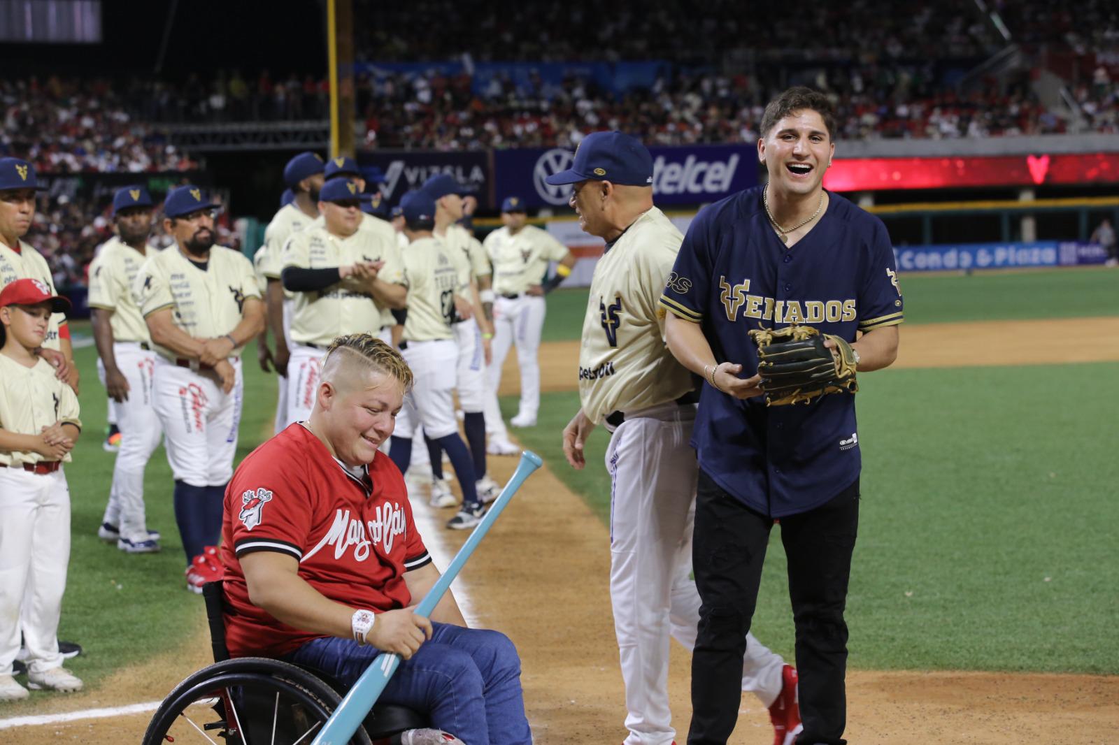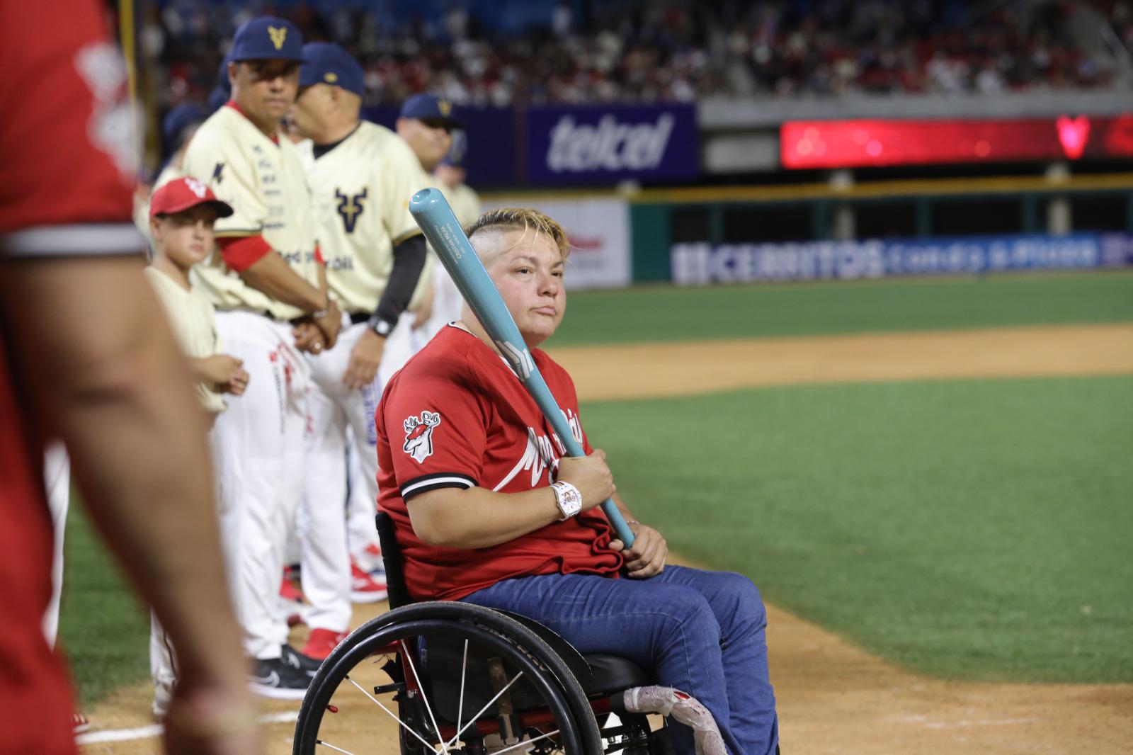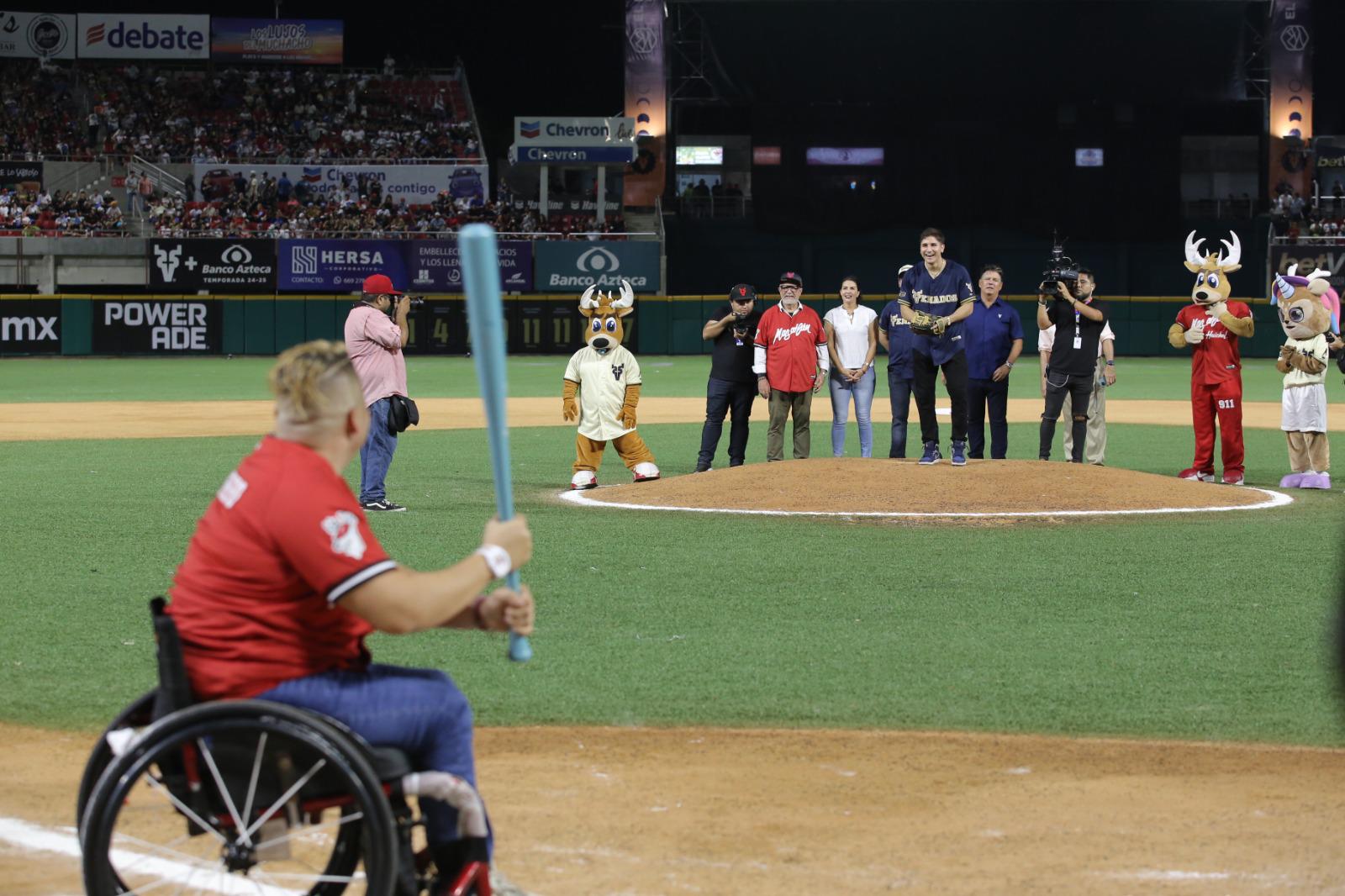 Al medallista de plata en boxeo le tocó el lanzamiento de la primera bola, como bateadora Guerrero Cázarez, medallista de bronce en Paralímpicos en la disciplina de lanzamiento de bala, y de cátcher fungió Pacho Burgos.