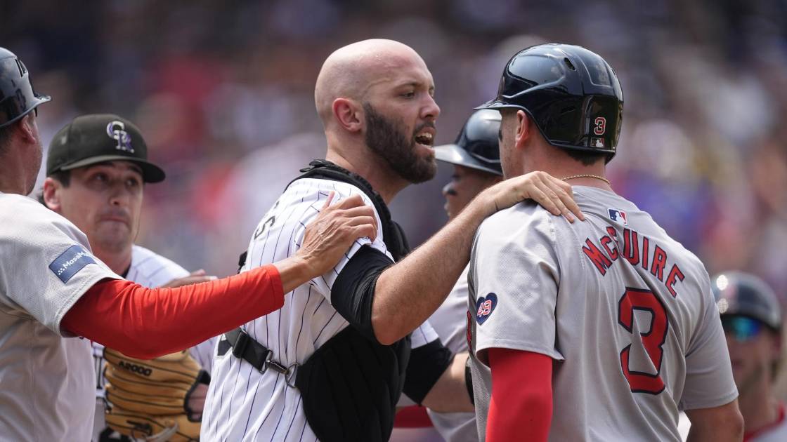 Las bancas se vaciaron en el Coors Field el miércoles, luego de que el lanzador de los Rockies de Colorado, Cal Quantrill, y el receptor de los Medias Rojas de Boston, Reese McGuire, se enfrentaron después de un elevado de out del careta en la parte alta del cuarto inning.