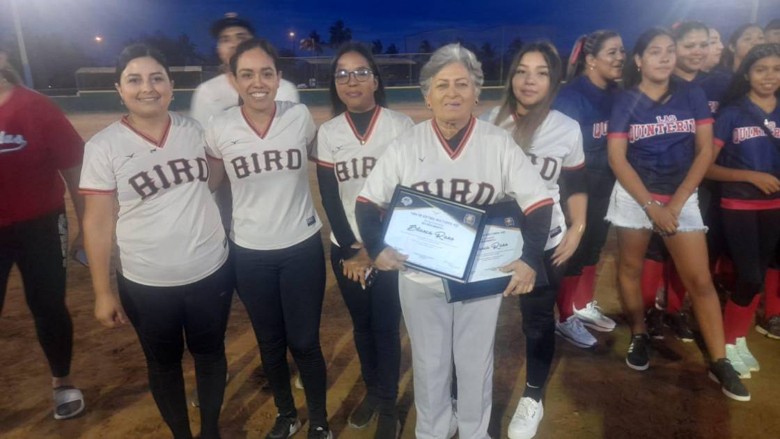 MAZATLÁN._ La figura del softbol mazatleco, Blanca Razo, fue reconocida al inaugurarse la primera Liga Nocturna de Softbol Femenil Antonio Quintero Castañeda, categorías Novatas y Tercera Fuerza.