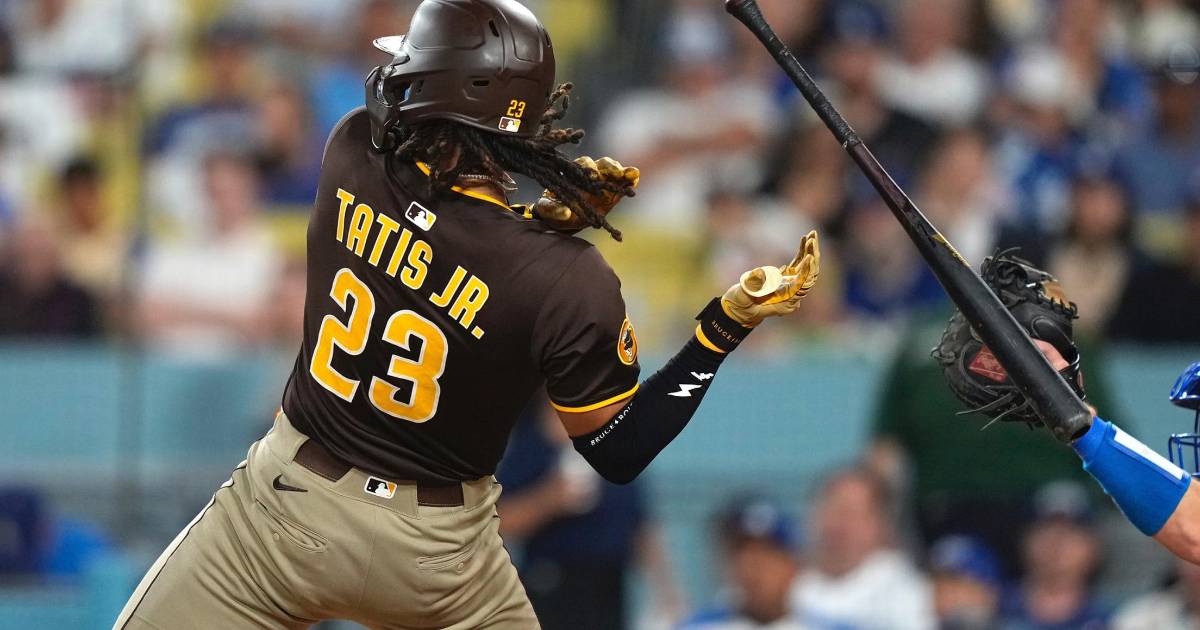 El dominicano Fernando Tatis Jr. fue golpeado por un lanzamiento del relevista de los Dodgers Jack Little en la novena entrada, la tercera vez que Tatis recibe un bolazo por parte de un lanzador de Los Angeles esta temporada.