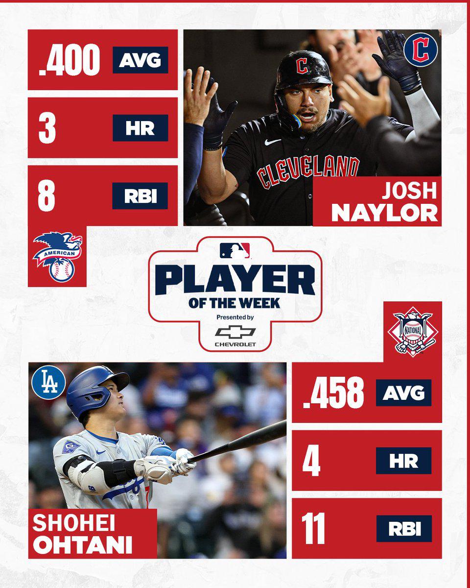 El bateador designado de los Dodgers, Shohei Ohtani, y el primera base de los Guardianes, Josh Naylor, son los Jugadores de la Semana en las ligas Nacional y Americana.