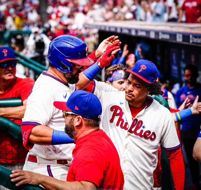 J.T. Realmuto pegó dos sencillos y produjo dos carreras para los campeones defensores de la Liga Nacional, que ganaron por primera vez desde el regreso a la alineación de Bryce Harper el martes. Harper, en su quinto partido después de la cirugía Tommy John en su codo derecho, batea para .368 (7 de 19) con una carrera producida después de irse de 3-1 con sencillo, base por bolas y dos carreras anotadas.