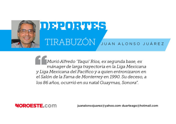CIUDAD DE MÉXICO._ Murió Alfredo “Yaqui” Ríos, ex segunda base, ex mánager de larga trayectoria en la Liga Mexicana y Liga Mexicana del Pacífico y a quien entronizaron en el Salón de la Fama de Monterrey en 1990. Su deceso, a los 86 años, ocurrió en su natal Guaymas, Sonora.