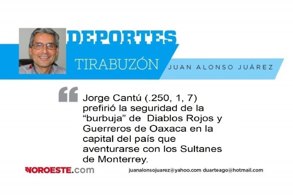 CIUDAD DE MÉXICO.- Jorge Cantú (.250, 1, 7) prefirió la seguridad de la “burbuja” de Diablos Rojos y Guerreros de Oaxaca en la capital del país, donde tendrá trabajado hasta el día de las Lupitas, que aventurarse con los Sultanes de Monterrey en un circuito que le fue hostil en sus últimas dos participaciones, hace más de un lustro.