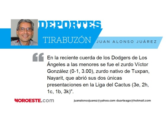 CIUDAD DE MÉXICO._ En la reciente cuerda de los Dodgers de Los Ángeles a las menores se fue el zurdo Víctor González (0-1, 3.00), zurdo nativo de Tuxpan, Nayarit, que abrió sus dos únicas presentaciones en la Liga del Cactus (3e, 2h, 1c, 1b, 3k).