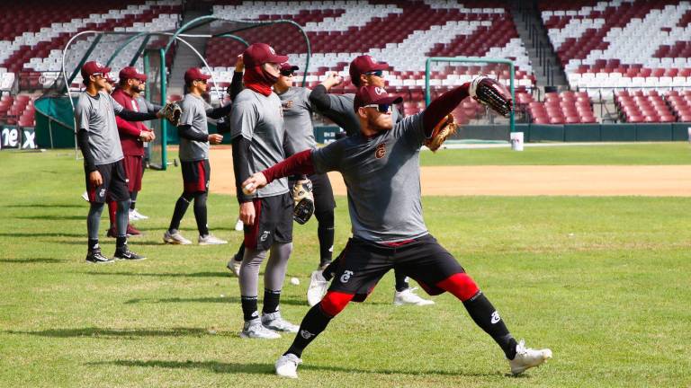 Víctor Castañeda trabaja con sesión Live BP desde el bullpen, en la práctica de Tomateros de Culiacán